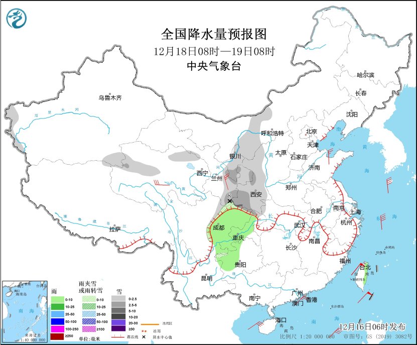 全国降水量预报图(12月18日08时-19日08时)。图片来源:中央气象台网站