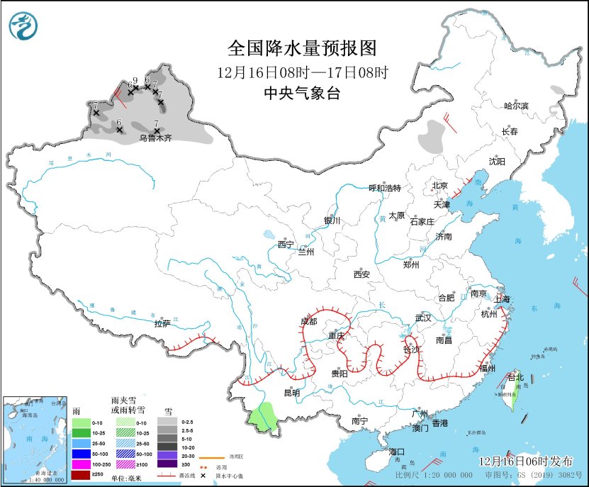 12月16日08时至17日08时,新疆北部、内蒙古中部等地部分地区有小雪,其中,塔城高海拔地区、伊犁河谷和沿天山地区等地部分地区有中到大雪(5~9毫米)。云南西南部、台湾岛东部等地部分地区有小雨。内蒙古东部、新疆北部等地部分地区有4~6级风。