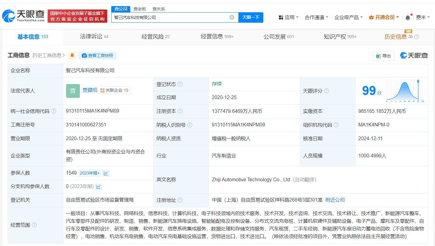 智己汽车科技有限公司成立于2020年12月,注册资本约137.7亿人民币,经营范围含从事汽车科技、网络科技、信息科技、计算机科技、电子科技领域内的技术服务、技术开发、技术咨询、技术交流、技术转让、技术推广等,由上海元界智能科技股权投资基金合伙企业(有限合伙)、杭州灏月企业管理有限公司、上汽集团(600104) 等共同持股。