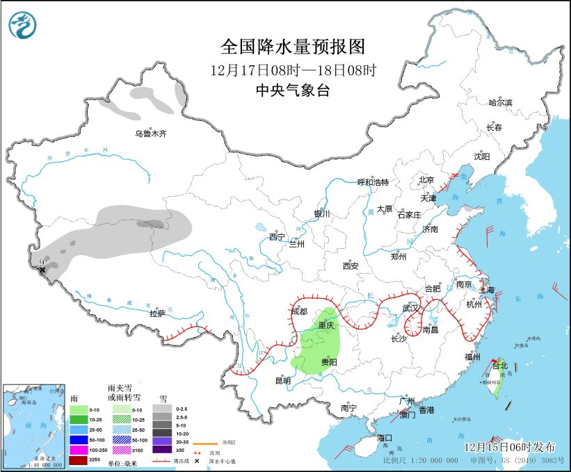 12月17日08时至18日08时,新疆北部、西藏北部和西部、青海西部等地部分地区有小雪,其中,西藏西部等地部分地区有中到大雪(5~9毫米)。重庆西部、贵州西部、台湾岛东部等地部分地区有小雨。浙江北部部分地区有4~5级风。