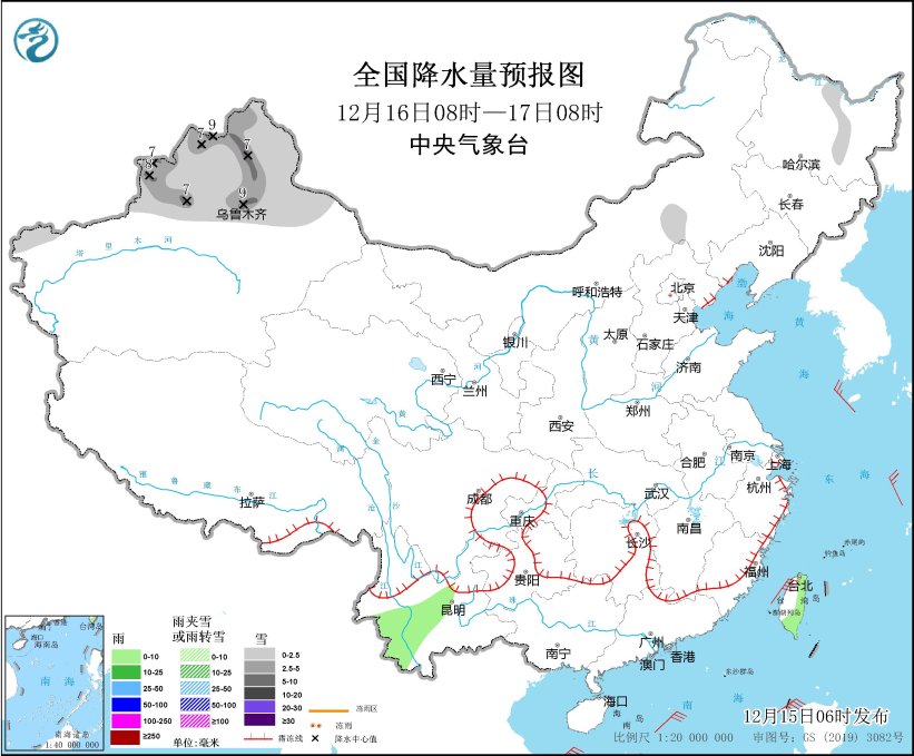 12月16日08时至17日08时,新疆北部部分地区有小到中雪,其中,新疆北疆北部、伊犁河谷和沿天山地区等地部分地区有大到暴雪(10~12毫米)。云南西部、台湾岛东部和南部等地部分地区有小雨。