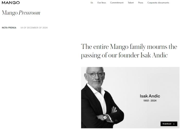 综合报道,西班牙时尚品牌Mango公司在一份声明中宣布,该公司创始人伊萨克·安迪克(Isak Andic)于当地时间12月14日意外去世。