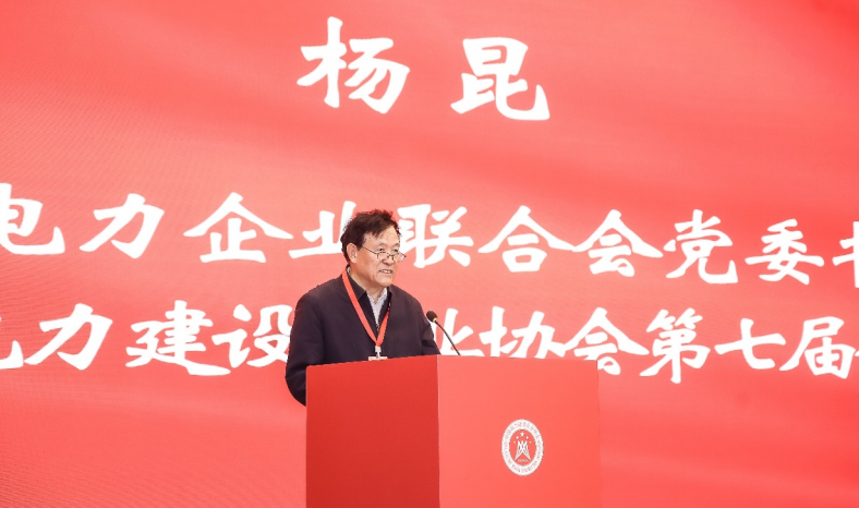 图为中国电力企业联合会党委书记、常务副理事长,中国电力建设企业协会第七届理事会会长杨昆讲话