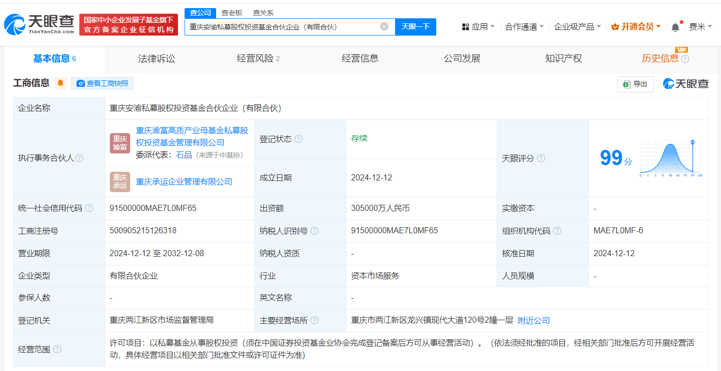 天眼查App显示,近日,重庆安渝私募股权投资基金合伙企业(有限合伙)成立,执行事务合伙人为重庆承运企业管理有限公司、重庆渝富高质产业母基金私募股权投资基金管理有限公司,出资额30.5亿人民币,经营范围为以私募基金从事股权投资。合伙人信息显示,该基金由重庆产业投资母基金合伙企业(有限合伙)、重庆两江新区高质量发展产业私募股权投资基金合伙企业(有限合伙)、重庆临空开发投资集团有限公司等共同出资。