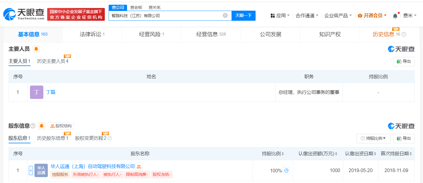 天眼查App显示,近日,智路科技(江苏)有限公司发生工商变更,李谦卸任法定代表人、执行董事、总经理,丁磊接任法定代表人、总经理,并担任执行公司事务的董事。