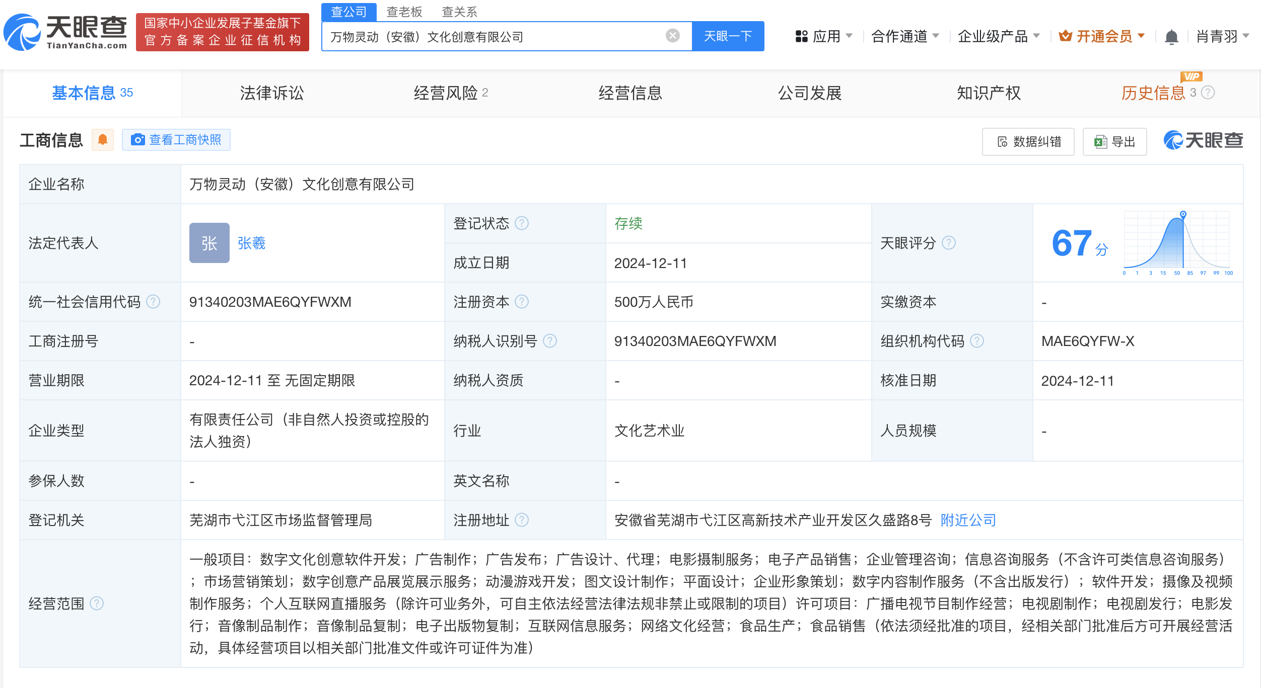 天眼查App显示,近日,万物灵动(安徽)文化创意有限公司成立,法定代表人为张羲,注册资本500万人民币,经营范围含数字文化创意软件开发、广告制作、广告发布、电影摄制服务、电子产品销售、市场营销策划、数字创意产品展览展示服务、动漫游戏开发等。股东信息显示,该公司由三只松鼠(300783)全资持股。
