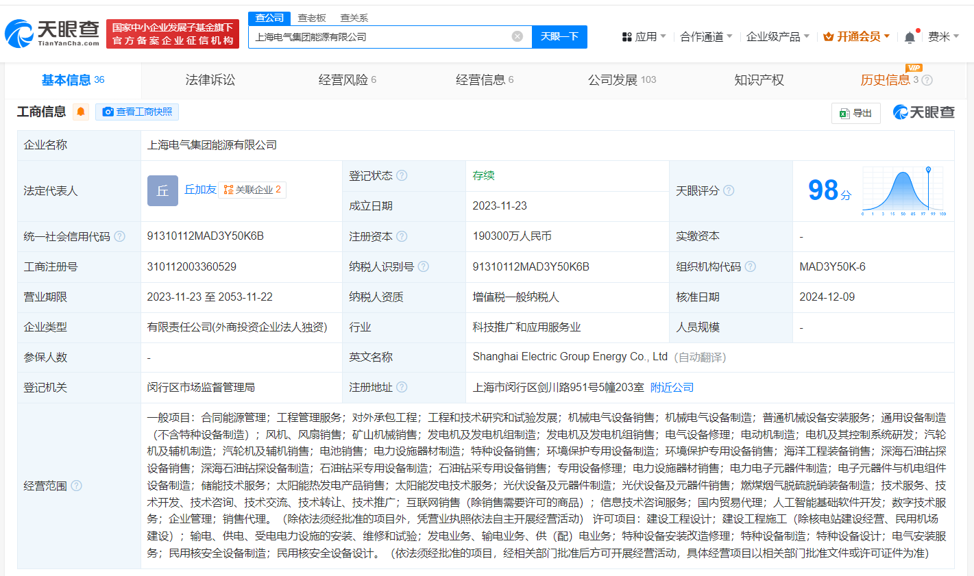 上海电气集团能源有限公司成立于2023年11月,法定代表人为丘加友,经营范围含合同能源管理、工程管理服务、对外承包工程、工程和技术研究和试验发展、机械电气设备销售、机械电气设备制造等,由上海电气(601727)全资持股。