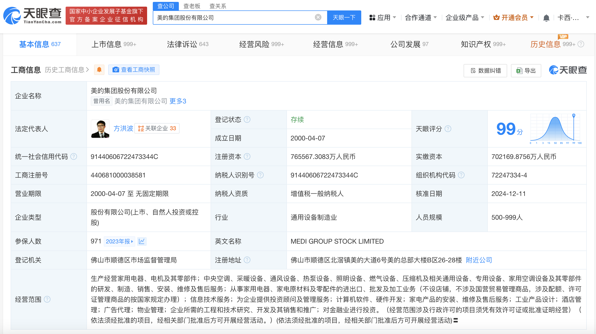 天眼查App显示,美的集团(000333)发生工商变更,注册资本由约69.8亿人民币增至约76.6亿人民币。