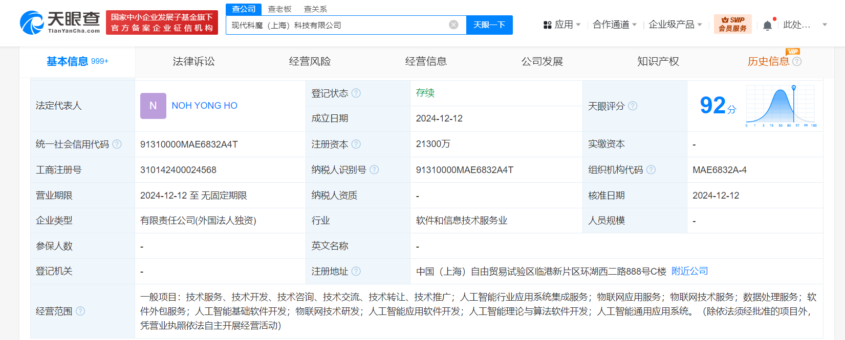 天眼查App显示,近日,现代科魔(上海)科技有限公司成立,法定代表人为NOH YONG HO,注册资本2.13亿人民币,经营范围含人工智能行业应用系统集成服务、物联网应用服务、数据处理服务、人工智能基础软件开发、人工智能应用软件开发、人工智能理论与算法软件开发等。股东信息显示,该公司由现代自动车株式会社全资持股。