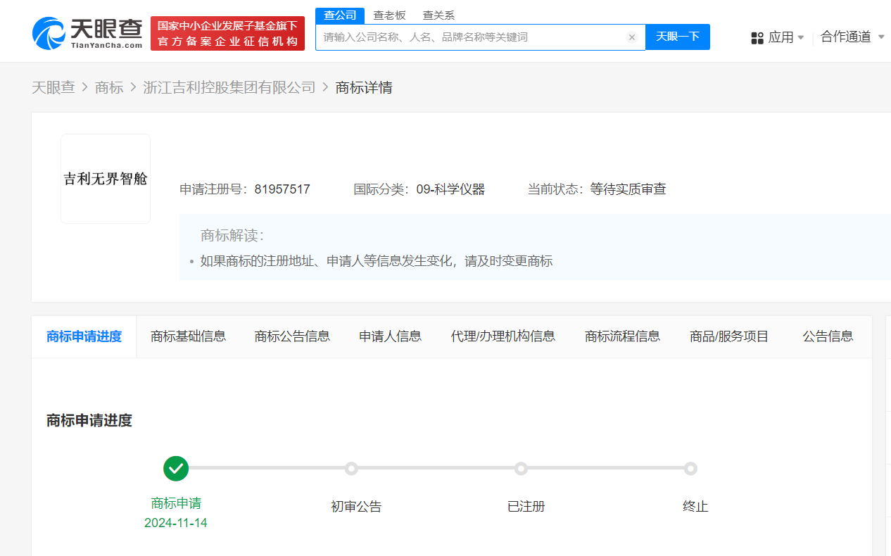 天眼查知识产权信息显示,近日,浙江吉利控股集团有限公司申请注册“吉利无界”“吉利无界智享”“吉利无界智舱”商标,国际分类为科学仪器、运输工具,当前商标状态均为等待实质审查。