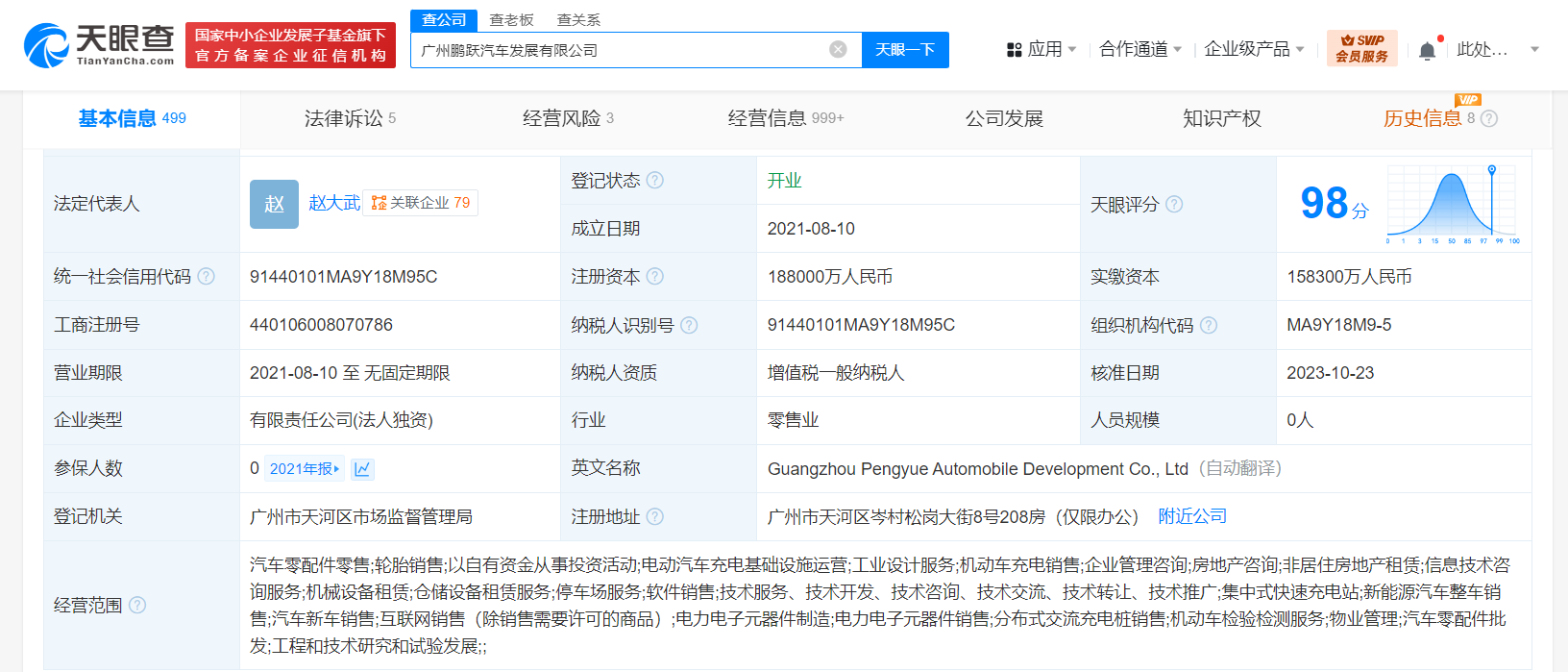 广州鹏跃汽车发展有限公司成立于2021年8月,法定代表人为赵大武,注册资本18.8亿人民币,经营范围含汽车零配件零售、轮胎销售、以自有资金从事投资活动、电动汽车充电基础设施运营、工业设计服务、机动车充电销售等,由广州小鹏汽车科技有限公司全资持股。