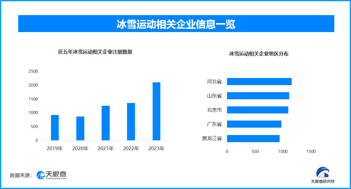 天眼查专业版数据显示,截至目前,现存与冰雪运动相关的企业近1.3万家,单就今年1-11月来看,就新增了相关企业2009家,无疑进入了增长新高峰。从企业年度注册量可以看出,冰雪运动相关企业注册量呈现出逐年递增趋势,并于2023年达到峰值,注册量达2110家;从地域分布来看,河北省、山东省、北京市三地不相上下,分别拥有相关企业1152家、1112家和1091家,位居其后的是一南一北的广东省和黑龙江省。