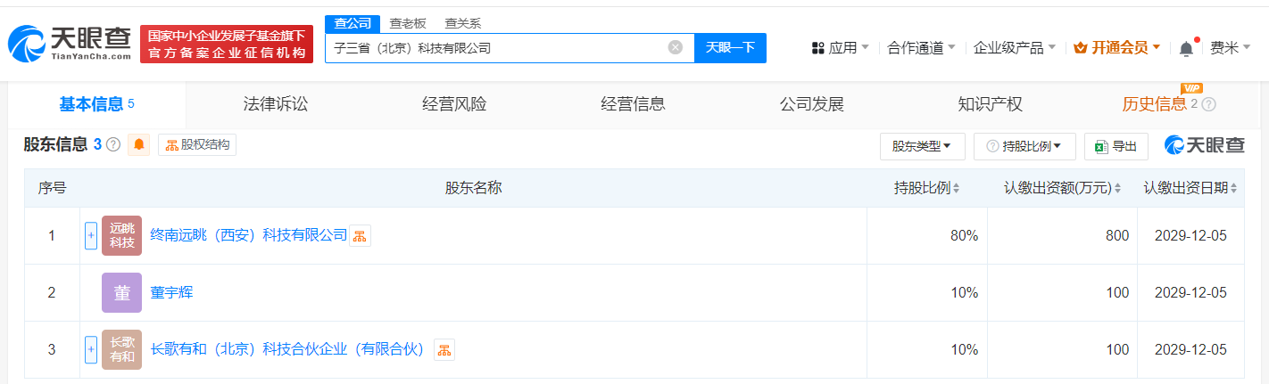天眼查App显示,近日,子三省(北京)科技有限公司成立,法定代表人为董宇辉,注册资本1000万人民币,经营范围含互联网信息服务、第一类增值电信业务、网络文化经营、电影放映、酒类经营、广播电视节目制作经营等。股东信息显示,该公司由终南远眺(西安)科技有限公司、董宇辉、长歌有和(北京)科技合伙企业(有限合伙)共同持股。值得一提的是,终南远眺(西安)科技有限公司、长歌有和(北京)科技合伙企业(有限合伙)均于近期成立,注册资本分别为1000万人民币、100万人民币。