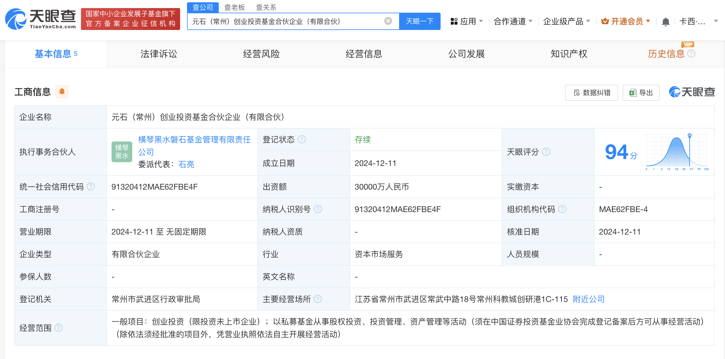 天眼查App显示,近日,元石(常州)创业投资基金合伙企业(有限合伙)成立,执行事务合伙人为横琴黑水磐石基金管理有限责任公司,出资额3亿人民币,经营范围为创业投资,以私募基金从事股权投资、投资管理、资产管理等活动。合伙人信息显示,该基金由润和软件(300339)、常州科教城产业投资基金(有限合伙)、常州汇智源点创业投资合伙企业(有限合伙)等共同出资。