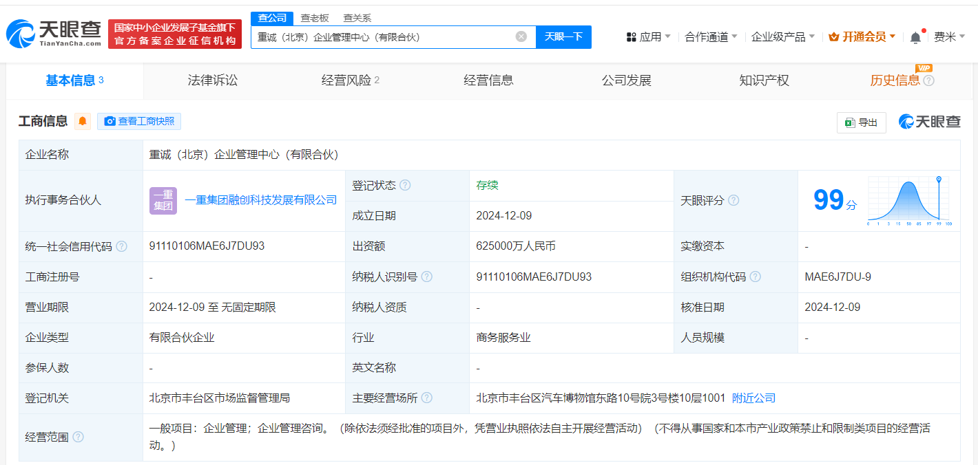 天眼查App显示,近日,重诚(北京)企业管理中心(有限合伙)成立,执行事务合伙人为一重集团融创科技发展有限公司,出资额62.5亿人民币,经营范围为企业管理、企业管理咨询,由中国诚通旗下北京诚通资本投资有限公司、中国一重集团有限公司及其旗下一重集团融创科技发展有限公司共同出资。