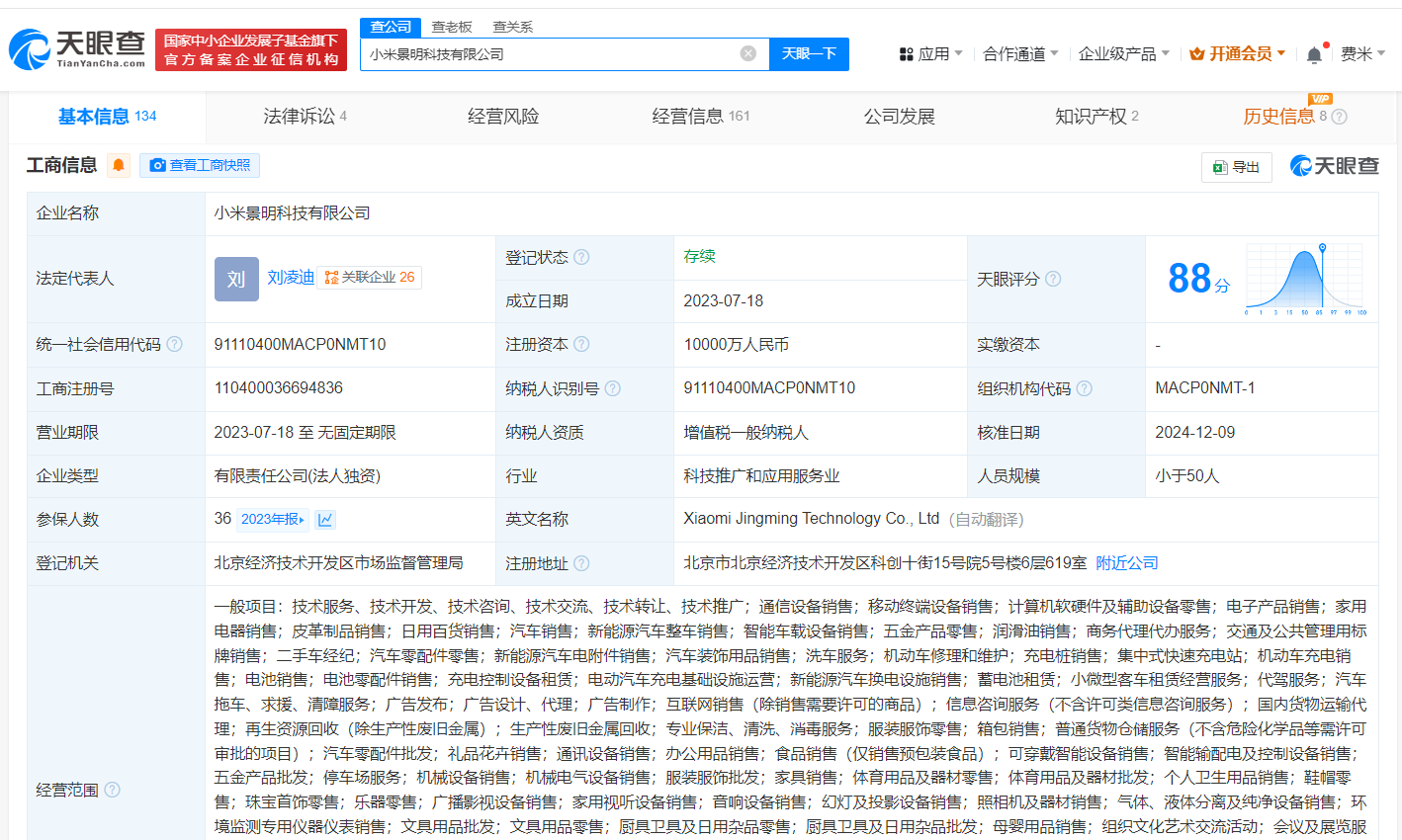 小米景明科技有限公司成立于2023年7月,法定代表人为刘凌迪,注册资本1亿人民币,由小米智能技术有限公司全资持股。