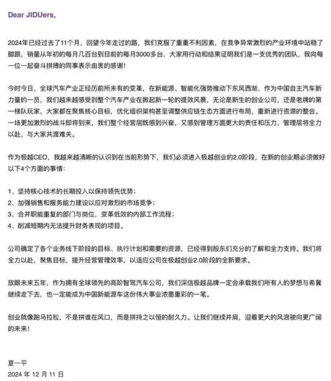 12月11日,极越CEO夏一平通过视频会议的方式与全体员工沟通,坦诚表明公司目前正遇到困难,需要立即调整,进入创业的2.0阶段,管理层将全力以赴,与全体员工共渡难关。