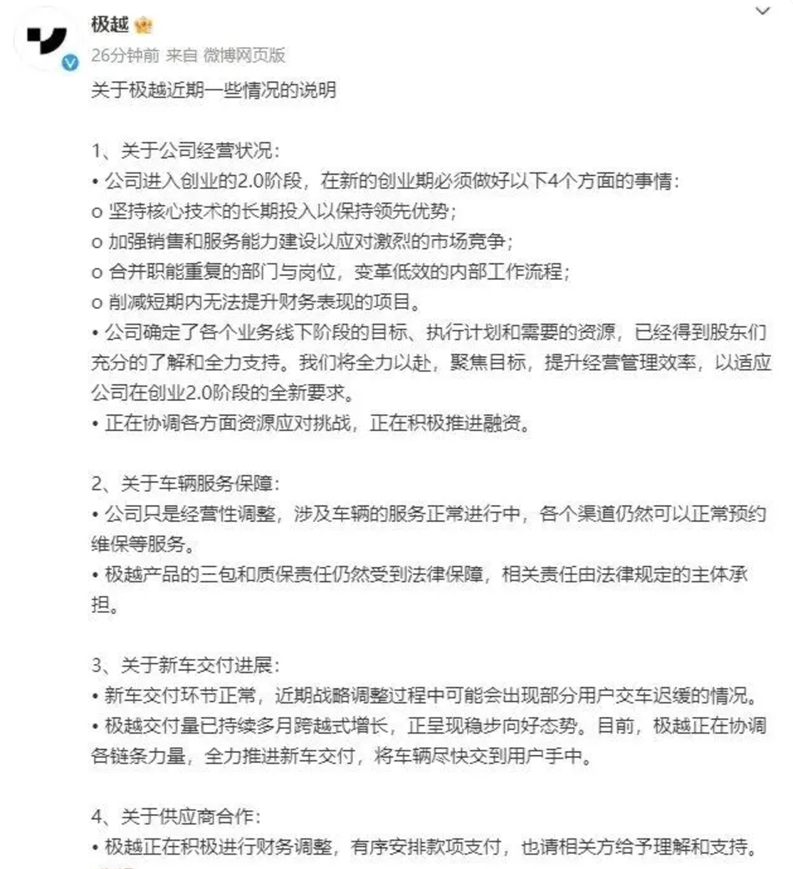 同日,极越汽车官方发布《关于极越近期一些情况的说明》,对于新车交付方面,声明称,新车交付环节正常,近期战略调整过程中可能会出现部分用户交车迟缓的情况。供应商合作方面,极越正在积极进行财务调整,有序安排款项支付,也请相关方给予理解和支持。