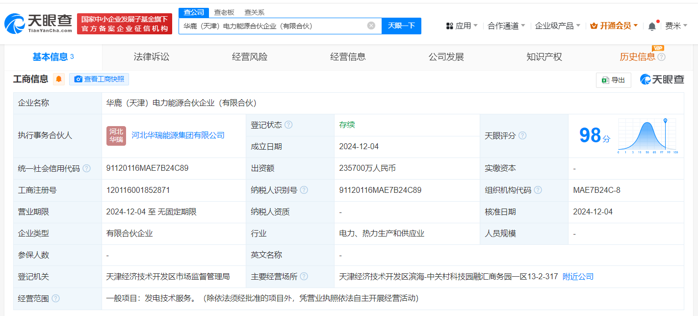 天眼查App显示,近日,华鹿(天津)电力能源合伙企业(有限合伙)成立,执行事务合伙人为河北华瑞能源集团有限公司,出资额约23.6亿人民币,经营范围为发电技术服务。合伙人信息显示,该合伙企业由中国康富(833499)、华电国际(600027)及其旗下河北华瑞能源集团有限公司共同出资。