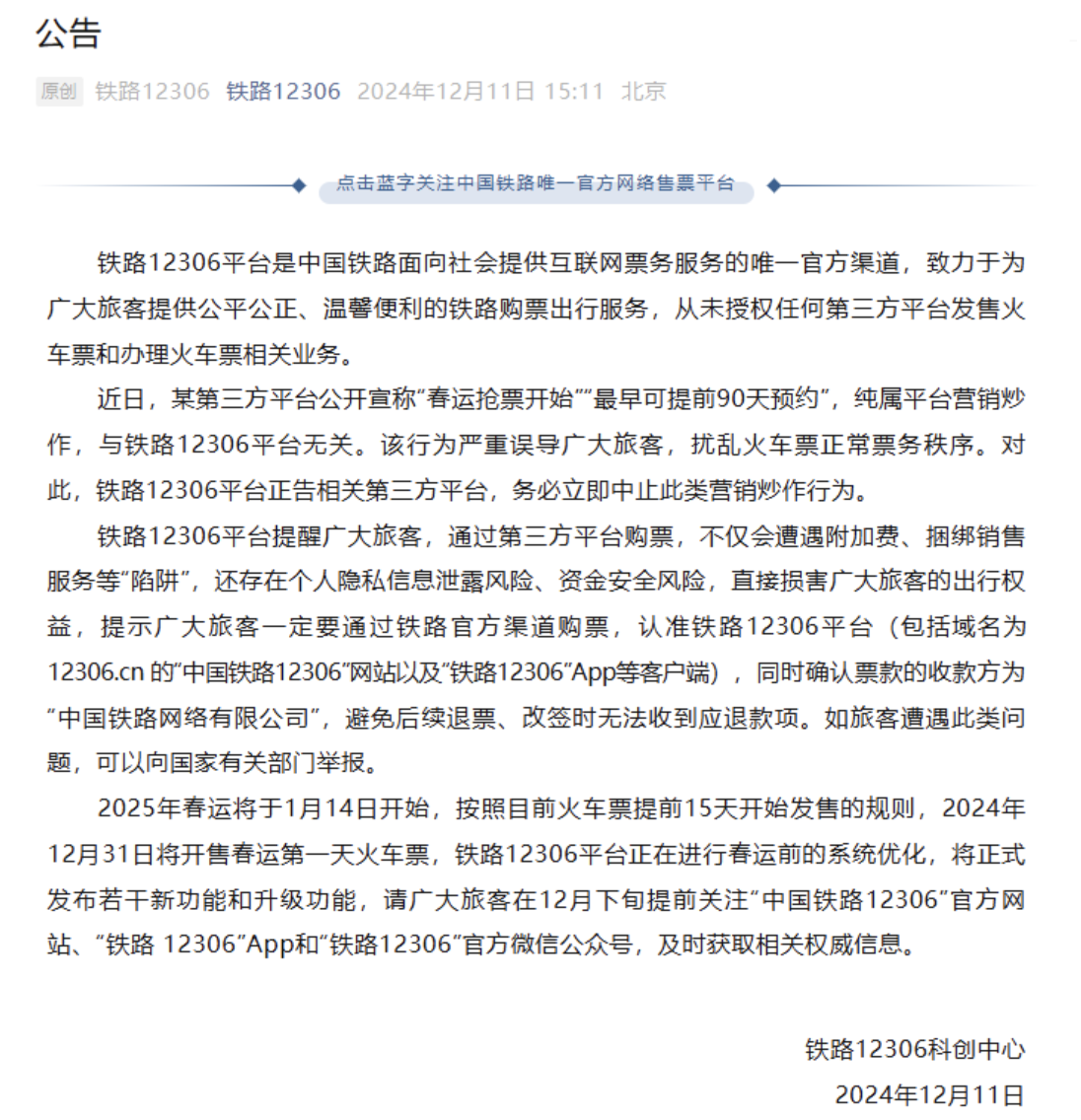 公告指出,近日,某第三方平台公开宣称“春运抢票开始”“最早可提前90天预约”,纯属平台营销炒作,与铁路12306平台无关。该行为严重误导广大旅客,扰乱火车票正常票务秩序。对此,铁路12306平台正告相关第三方平台,务必立即中止此类营销炒作行为。