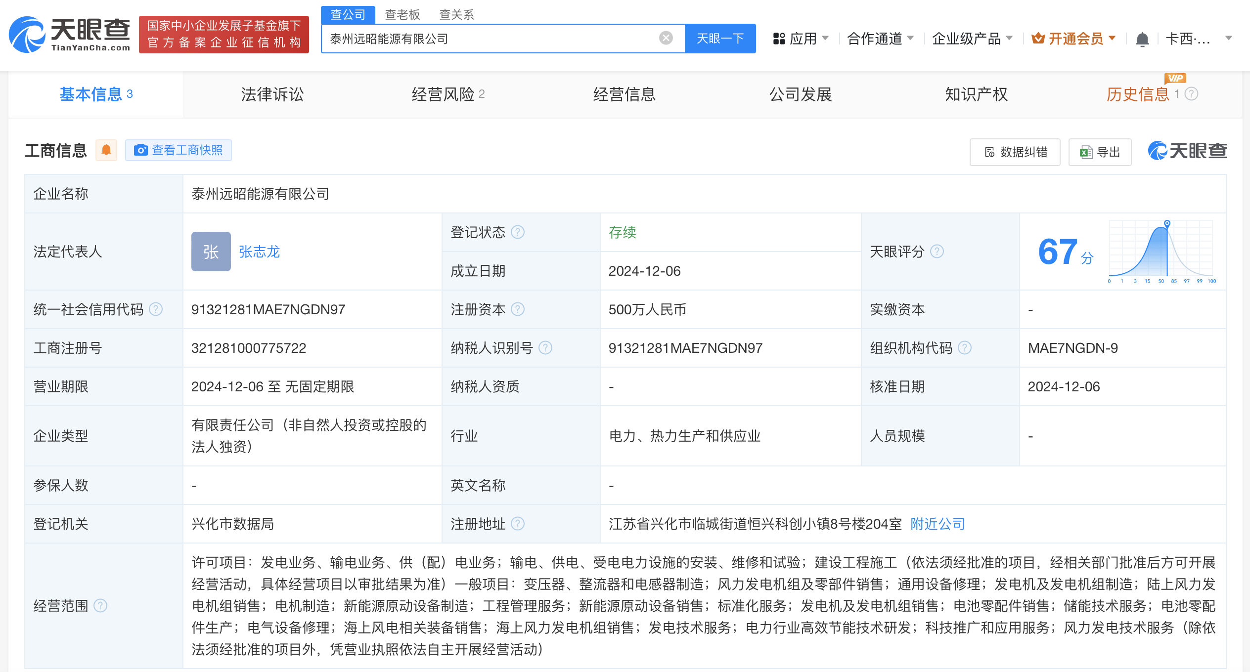 天眼查App显示,近日,泰州远昭能源有限公司成立,法定代表人为张志龙,注册资本500万人民币,经营范围含电机制造、新能源原动设备制造、工程管理服务、储能技术服务等。股东信息显示,该公司由远景能源有限公司全资持股。