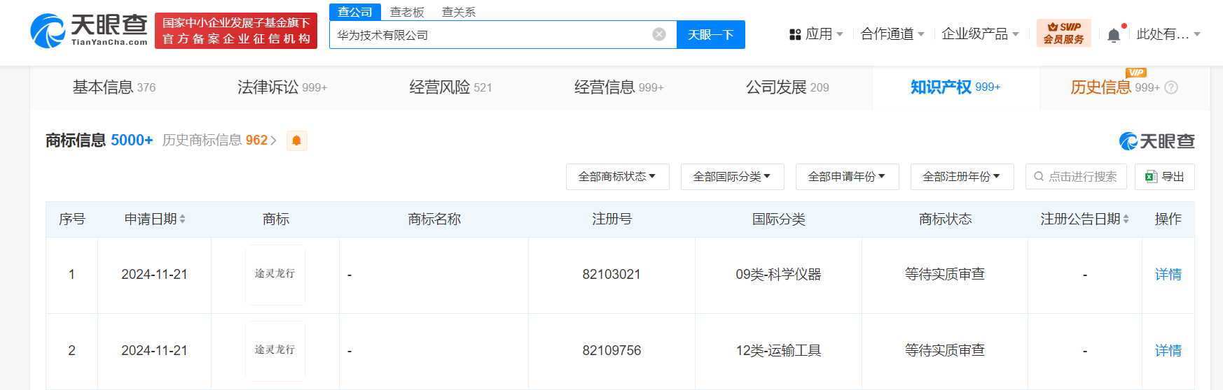 天眼查知识产权信息显示,近日,华为技术有限公司申请注册两枚“途灵龙行”商标,国际分类为运输工具、科学仪器,当前商标状态均为等待实质审查。
