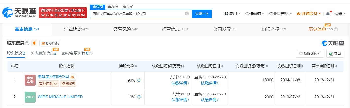 四川长虹佳华信息产品有限责任公司成立于2004年10月,法定代表人为祝剑秋,经营范围含出版物批发、出版物互联网销售、计算机软硬件及辅助设备批发、计算机软硬件及辅助设备零售、电子产品销售、家用电器销售等,由港虹实业有限公司、WIDE MIRACLE LIMITED共同持股。