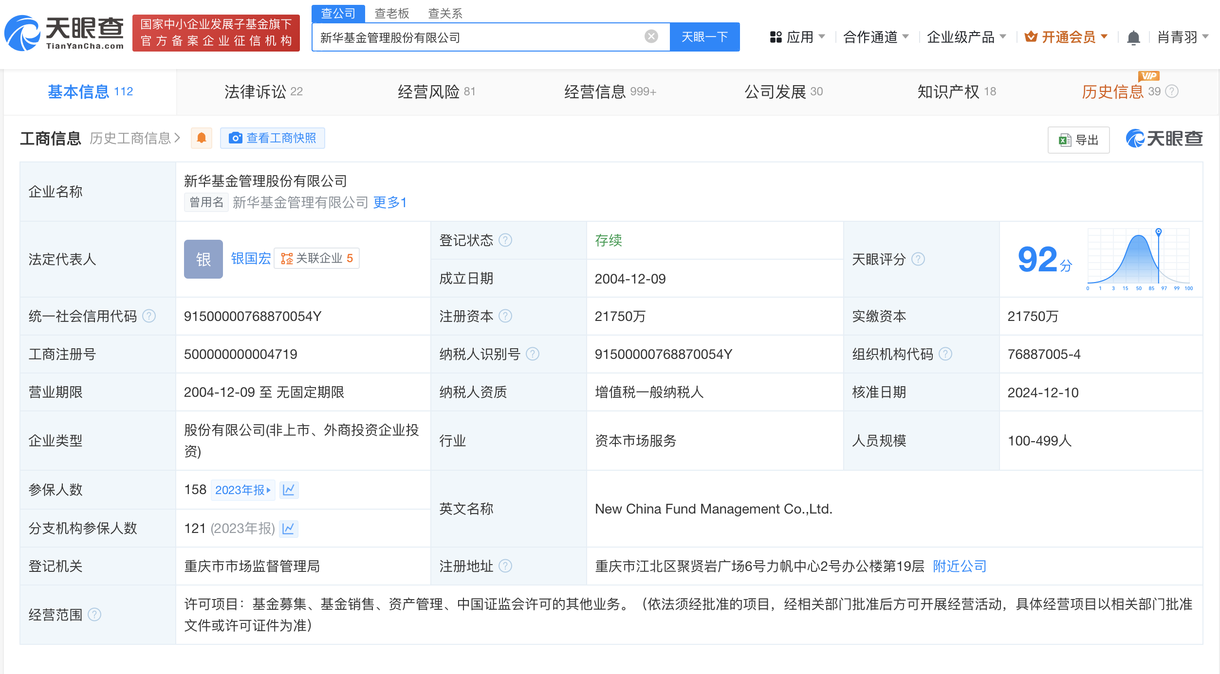 新华基金管理股份有限公司成立于2004年12月,注册资本约2.2亿人民币,经营范围含基金募集、基金销售、资产管理、中国证监会许可的其他业务,由新华信托股份有限公司、恒泰证券股份有限公司、杭州永原网络科技有限公司共同持股。此前,新华基金发布公告称,董事长于春玲因个人原因离任董事长职务,新任董事长则是来自股东方的银国宏。