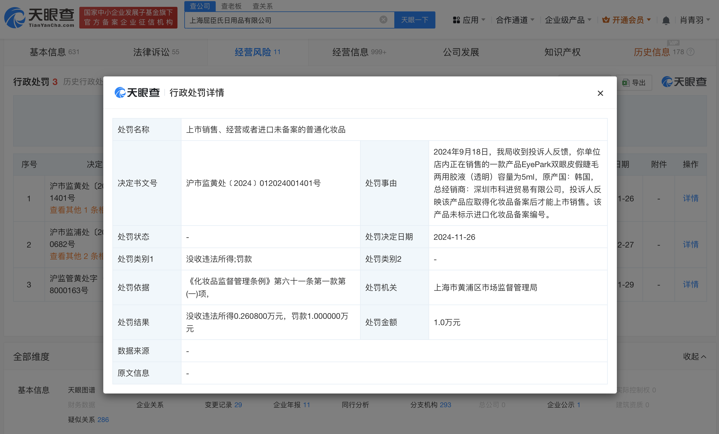处罚事由显示,2024年9月18日,该局收到投诉人反馈,当事人店内正在销售的一款产品Eye Park双眼皮假睫毛两用胶液(透明)容量为5ml,原产国:韩国,总经销商:深圳市科进贸易有限公司,投诉人反映该产品应取得化妆品备案后才能上市销售。该产品未标示进口化妆品备案编号。