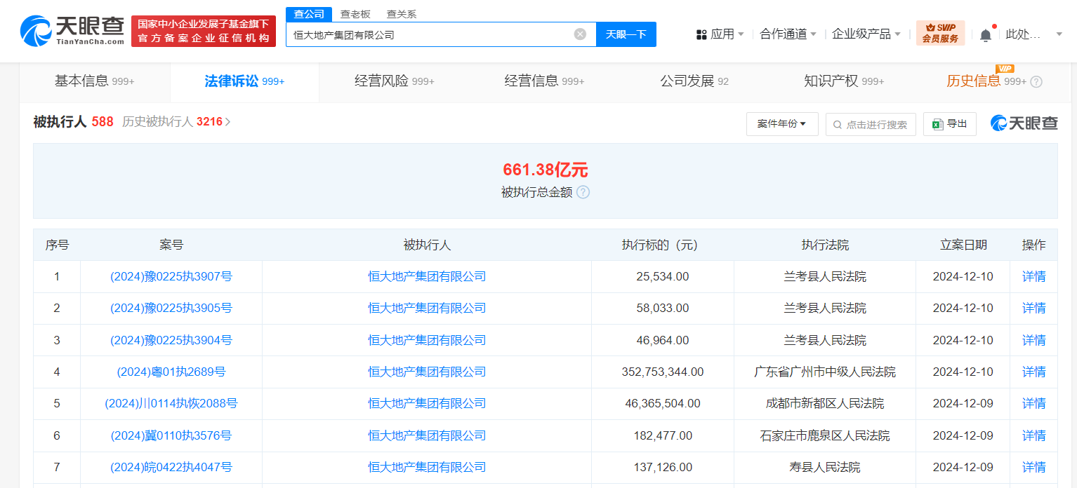 天眼查法律诉讼信息显示,12月9日至10日,恒大地产集团有限公司新增7条被执行人及恢复执行信息,执行标的合计3.99亿余元,涉及金融借款合同纠纷、建设工程合同纠纷等案件,部分案件被执行人还包括恒大地产集团兰州置业有限公司、兰州天华房地产开发有限公司等,执行法院为广东省广州市中级人民法院、成都市新都区人民法院等。