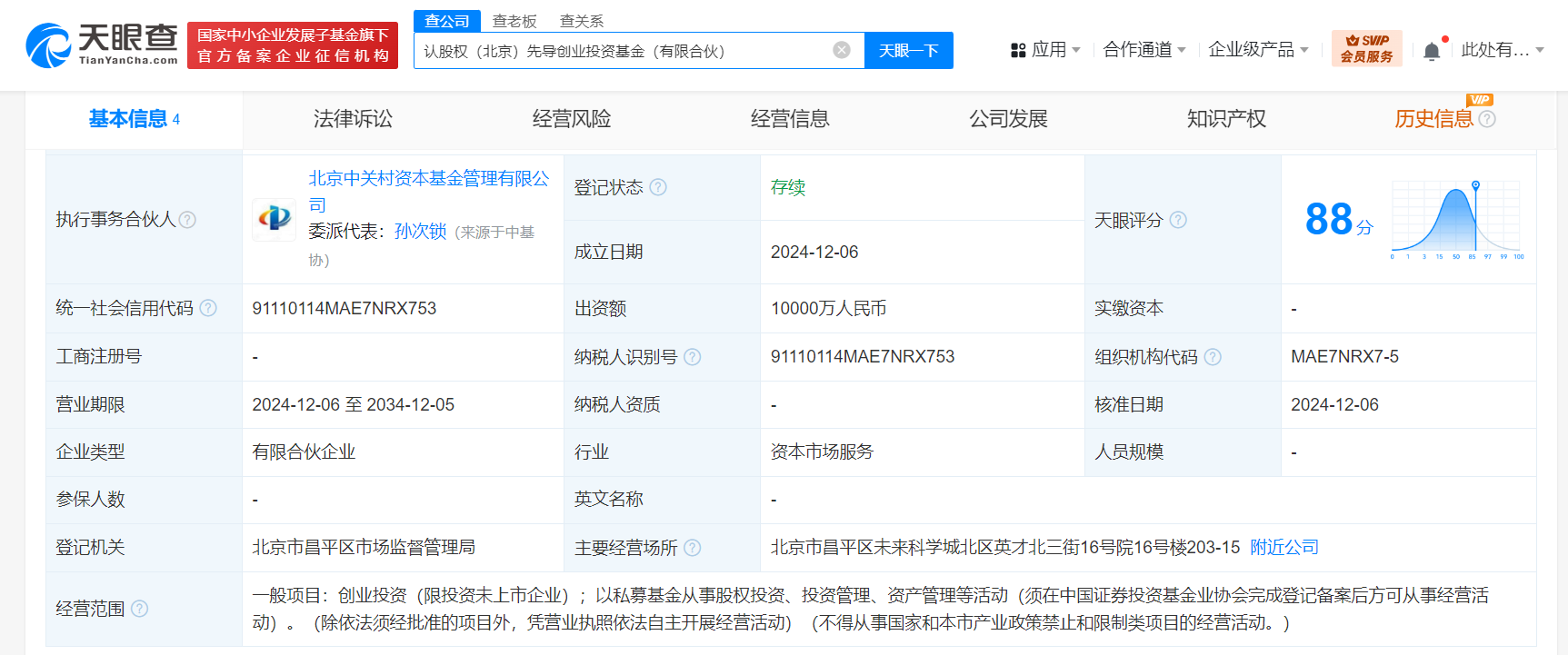 天眼查App显示,近日,认股权(北京)先导创业投资基金(有限合伙)成立,执行事务合伙人为北京中关村资本基金管理有限公司,出资额1亿人民币,经营范围为创业投资,以私募基金从事股权投资、投资管理、资产管理等活动。合伙人信息显示,该基金由北银理财有限责任公司、北京中关村资本基金管理有限公司、北京和谐嘉瑞投资管理有限公司共同出资。
