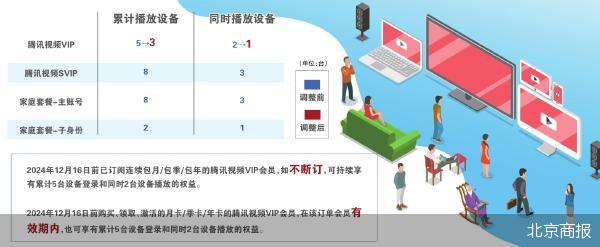 具体到老会员权益,2024年12月16日前已订阅连续包月/包季/包年的腾讯视频VIP会员,如不断订可持续享有累计5台设备登录和同时2台设备播放的权益。2024年12月16日前购买、领取、激活的月卡/季卡、/年卡的腾讯视频VIP会员,在该订单会员有效期内,也可享有累计5台设备登录和同时2台设备播放的权益。