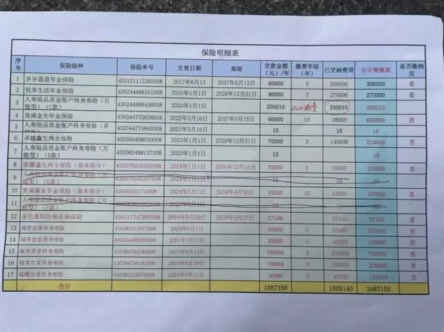 “我婆婆就是和我们说,她马上要发财了,会有几百万,我们当时就想,她每月2800元的退休工资,怎么会发财呢?后面就有亲戚和我们说,她买了好多保险,我们查了之后才发现。”王女士说,这些保险全部买完,还需陆续交200万,这让家人都感到难以置信。“倾家荡产我们都交不起。”