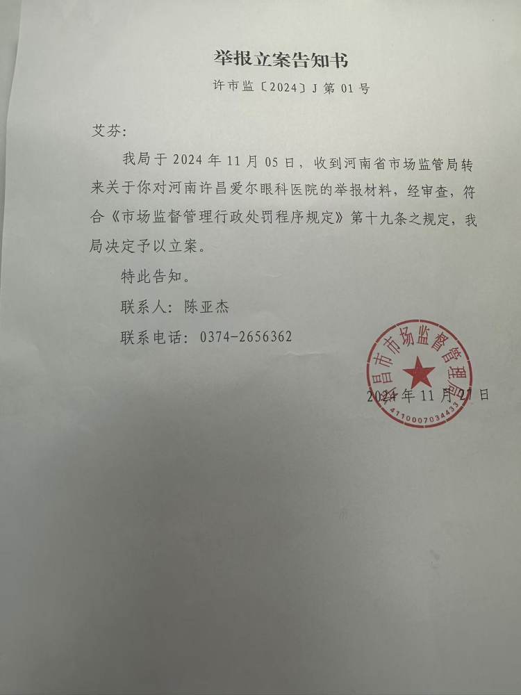 许昌市市场监督管理局相关负责人称,已要求许昌爱尔眼科医院限期提供材料,案件正在调查中。