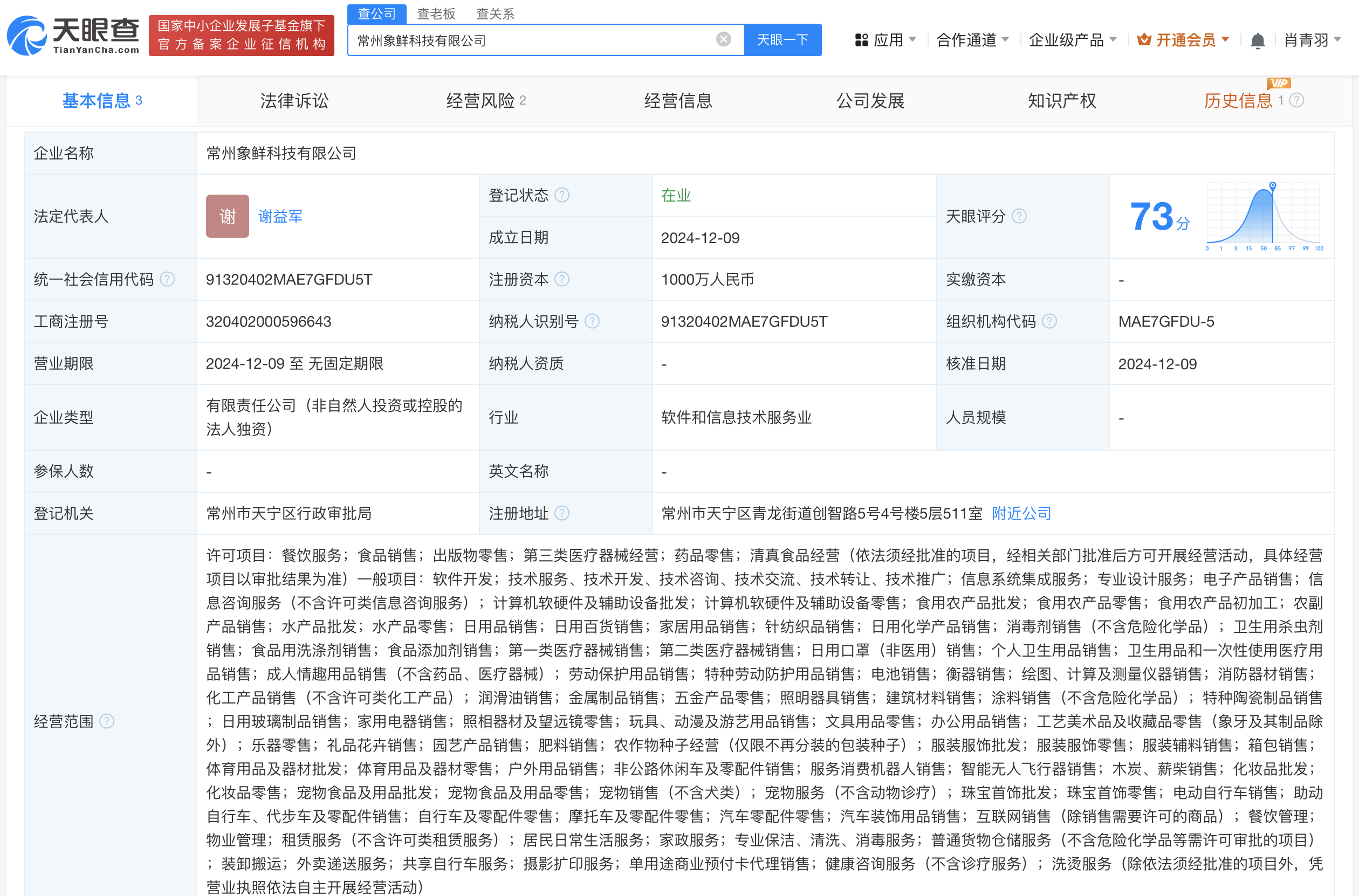 天眼查App显示,近日,常州象鲜科技有限公司成立,法定代表人为谢益军,注册资本1000万人民币,经营范围含餐饮服务、食品销售、出版物零售、第三类医疗器械经营、药品零售、清真食品经营等。股东信息显示,该公司由北京象鲜科技有限公司全资持股。