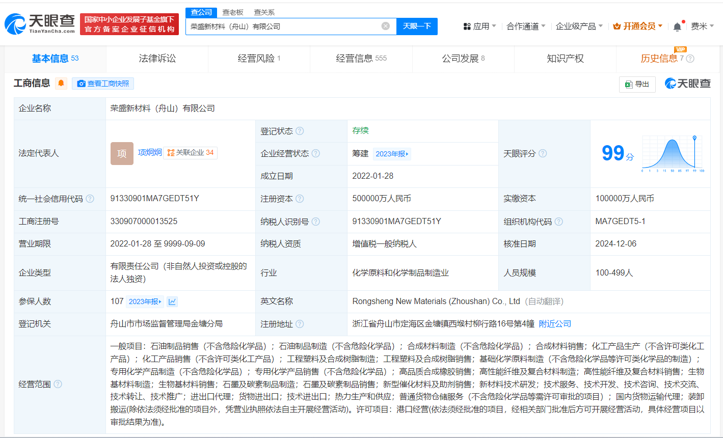 荣盛新材料(舟山)有限公司成立于2022年1月,法定代表人为项炯炯,经营范围含石油制品销售、石油制品制造、合成材料制造、合成材料销售、化工产品生产、化工产品销售等,由荣盛石化(002493)全资持股。