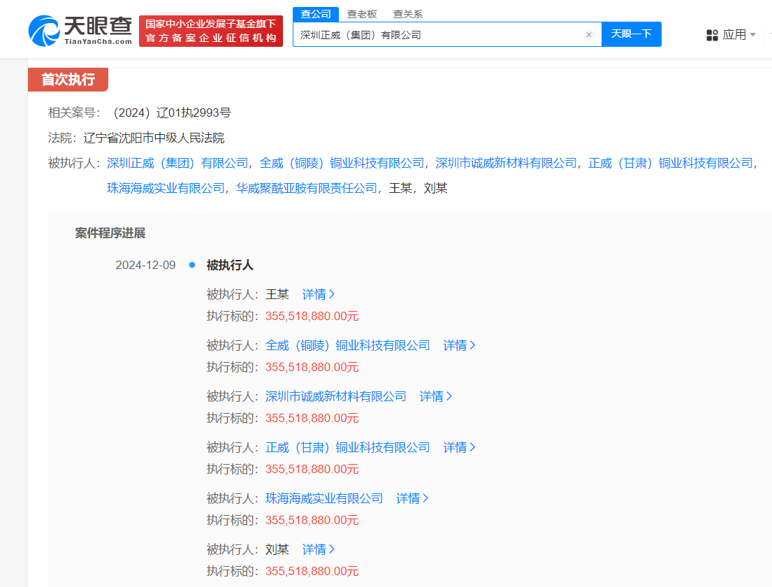 天眼查法律诉讼信息显示,近日,深圳正威(集团)有限公司、全威(铜陵)铜业科技有限公司、深圳市诚威新材料有限公司、王文银等新增一条被执行人信息,执行标的3.55亿余元,涉及金融借款合同纠纷案件,执行法院为辽宁省沈阳市中级人民法院。