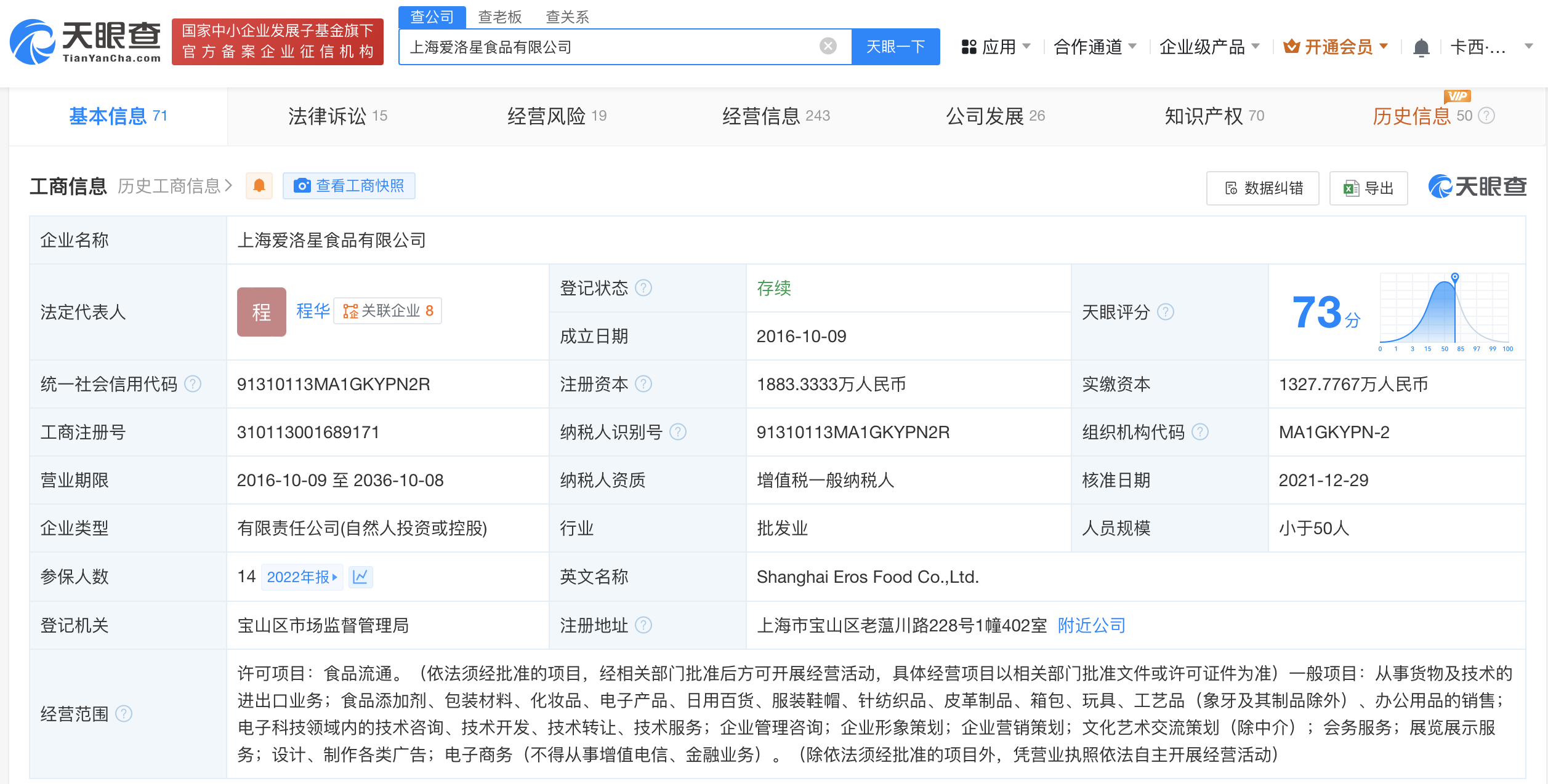 天眼查法律诉讼信息显示,近日,上海爱洛星食品有限公司新增1条被执行人信息,执行标的14.8万余元,执行法院为咸宁市咸安区人民法院。