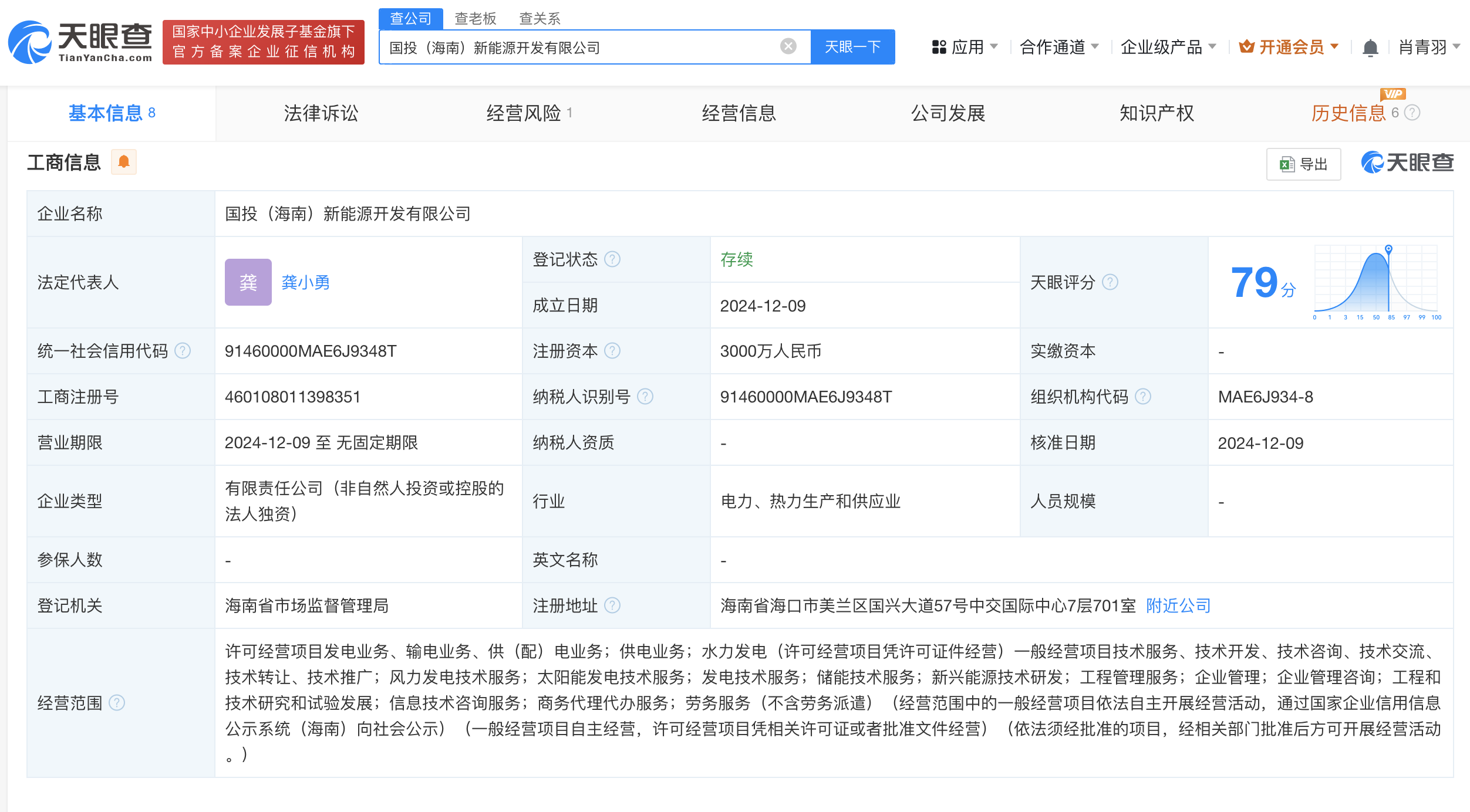 天眼查App显示,近日,国投(海南)新能源开发有限公司成立,法定代表人为龚小勇,注册资本3000万人民币,经营范围含风力发电技术服务、太阳能发电技术服务、发电技术服务、储能技术服务、新兴能源技术研发、工程管理服务、企业管理、企业管理咨询等。股东信息显示,该公司由国投电力(600886)全资持股。