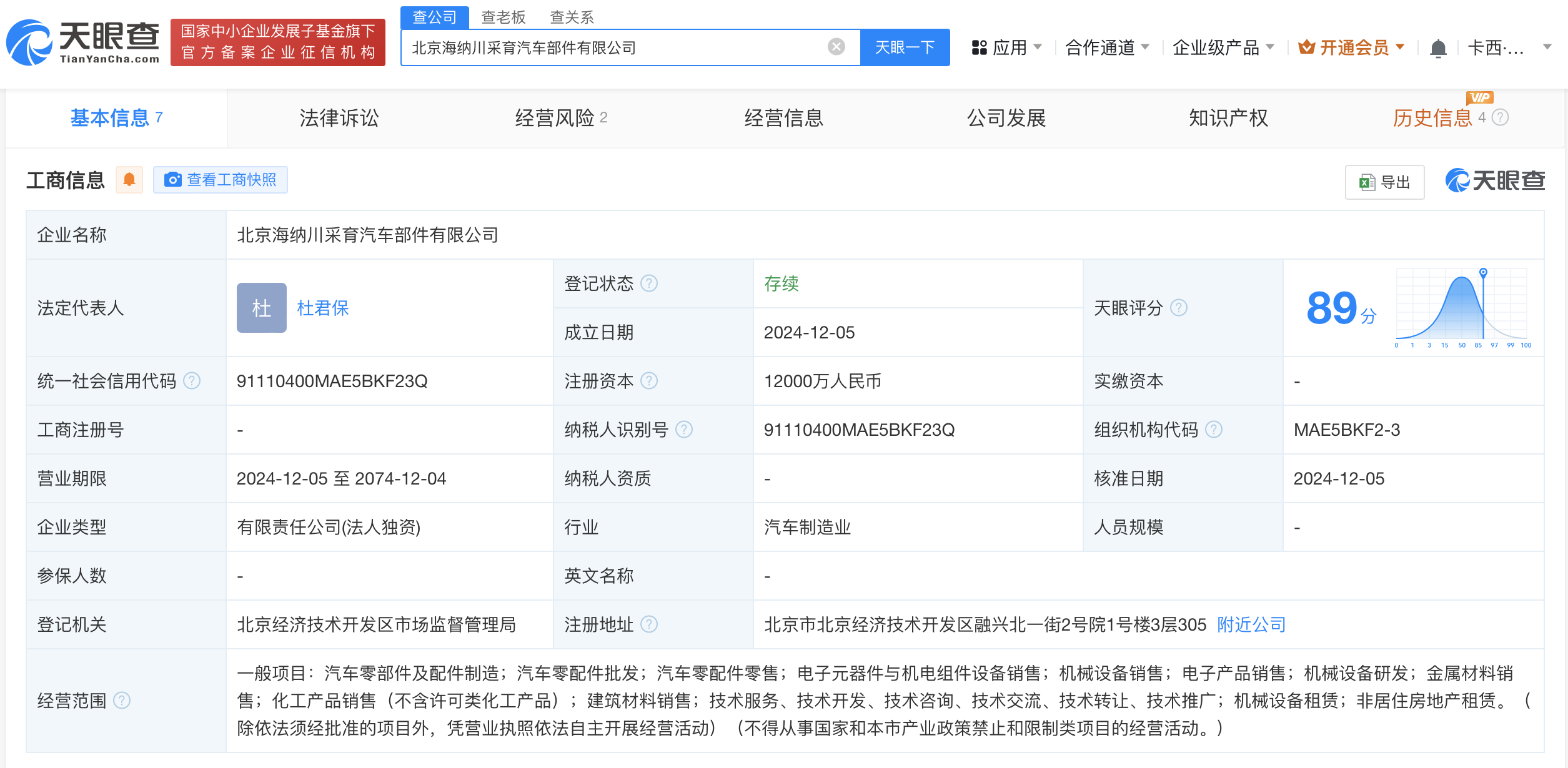 天眼查App显示,近日,北京海纳川采育汽车部件有限公司成立,法定代表人为杜君保,注册资本1.2亿人民币,经营范围含汽车零部件及配件制造、汽车零配件批发、汽车零配件零售、电子元器件与机电组件设备销售等。股权全景穿透图显示,该公司由北汽集团旗下北京海纳川汽车部件股份有限公司全资持股。