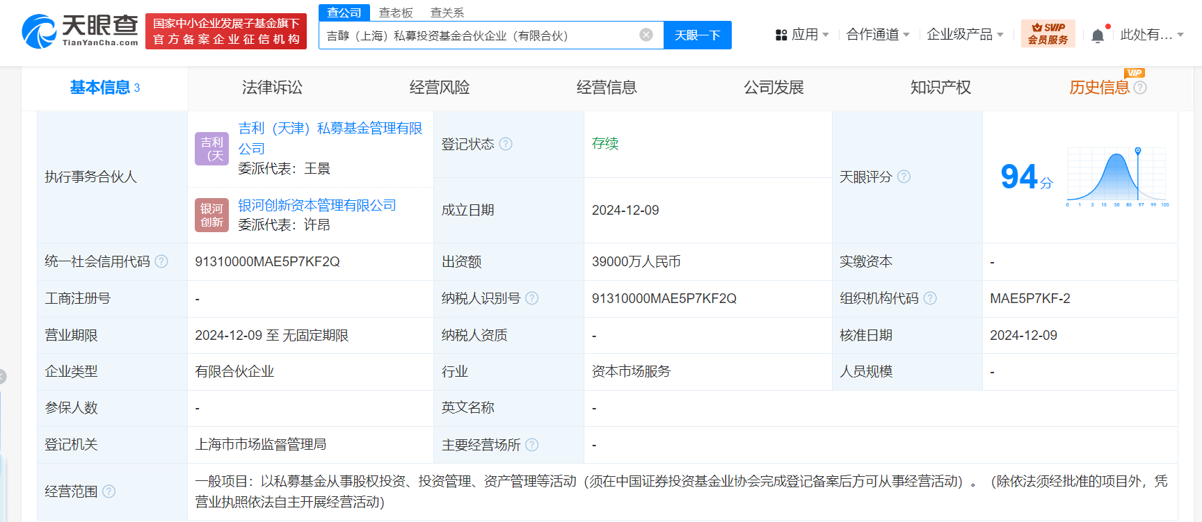 眼查App显示,近日,吉醇(上海)私募投资基金合伙企业(有限合伙)成立,执行事务合伙人为吉利(天津)私募基金管理有限公司、银河创新资本管理有限公司,出资额3.9亿人民币,经营范围为以私募基金从事股权投资、投资管理、资产管理等活动。合伙人信息显示,该基金由吉利旗下浙江吉利远程新能源商用车集团有限公司、吉利(天津)私募基金管理有限公司以及中国银河(601881)旗下银河创新资本管理有限公司共同出资。