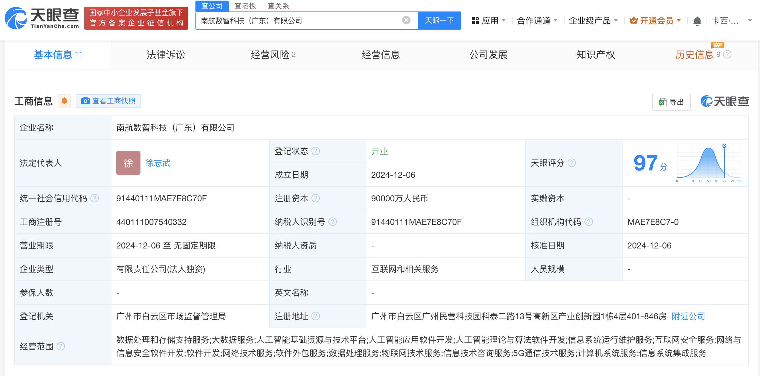 天眼查App显示,近日,南航数智科技(广东)有限公司成立,法定代表人为徐志武,注册资本9亿人民币,经营范围含数据处理和存储支持服务、大数据服务、人工智能基础资源与技术平台、人工智能应用软件开发、人工智能理论与算法软件开发等。股东信息显示,该公司由南方航空(600029)全资持股。
