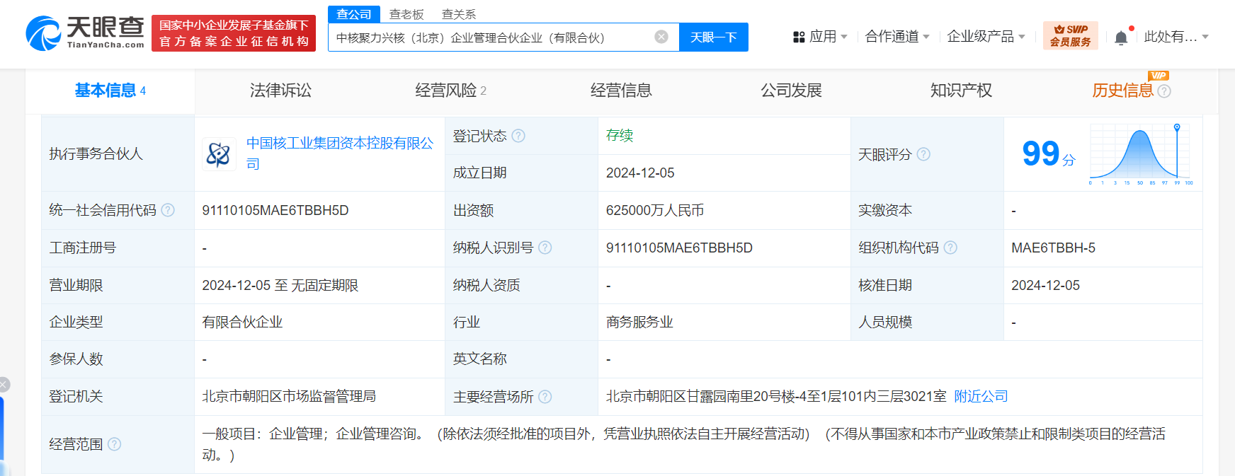天眼查App显示,近日,中核聚力兴核(北京)企业管理合伙企业(有限合伙)成立,执行事物合伙人为中国核工业集团资本控股有限公司,出资额62.5亿人民币,经营范围为企业管理、企业管理咨询。合伙人信息显示,该企业由中国诚通旗下北京诚通资本投资有限公司、中国核工业集团有限公司及旗下中国核工业集团资本控股有限公司共同出资。