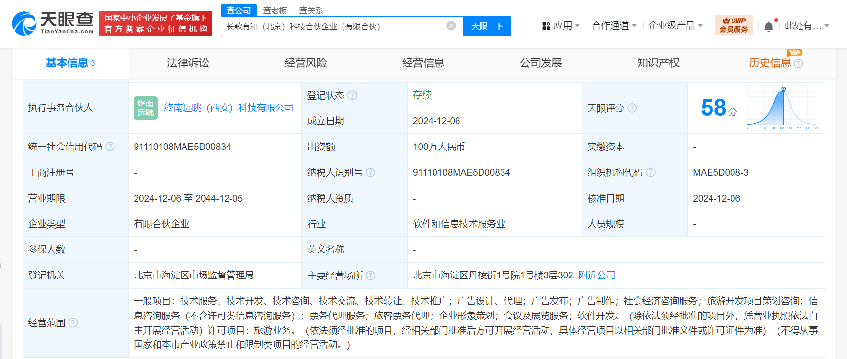 天眼查App显示,近日,长歌有和(北京)科技合伙企业(有限合伙)成立,执行事务合伙人为终南远眺(西安)科技有限公司,出资额100万人民币,经营范围含社会经济咨询服务、旅游开发项目策划咨询、票务代理服务、旅客票务代理、软件开发、旅游业务等。合伙人信息显示,该企业由董宇辉、终南远眺(西安)科技有限公司分别出资99.9%、0.1%。