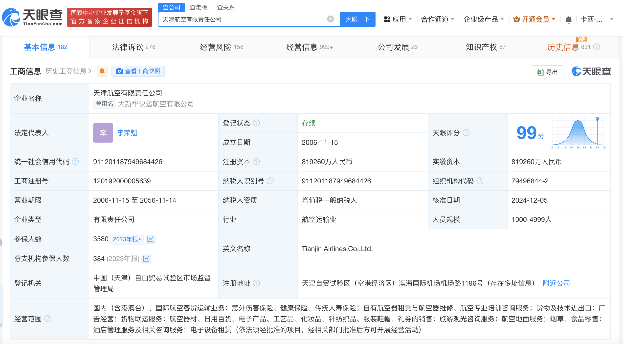 天津航空有限责任公司成立于2006年11月,注册资本约81.93亿人民币,经营范围含国内(含港澳台)、国际航空客货运输业务,自有航空器租赁与航空器维修、航空专业培训咨询服务等,由海口臻平投资有限责任公司、海航控股(600221)、天津保税区投资有限公司、海航航空集团有限公司共同持股。
