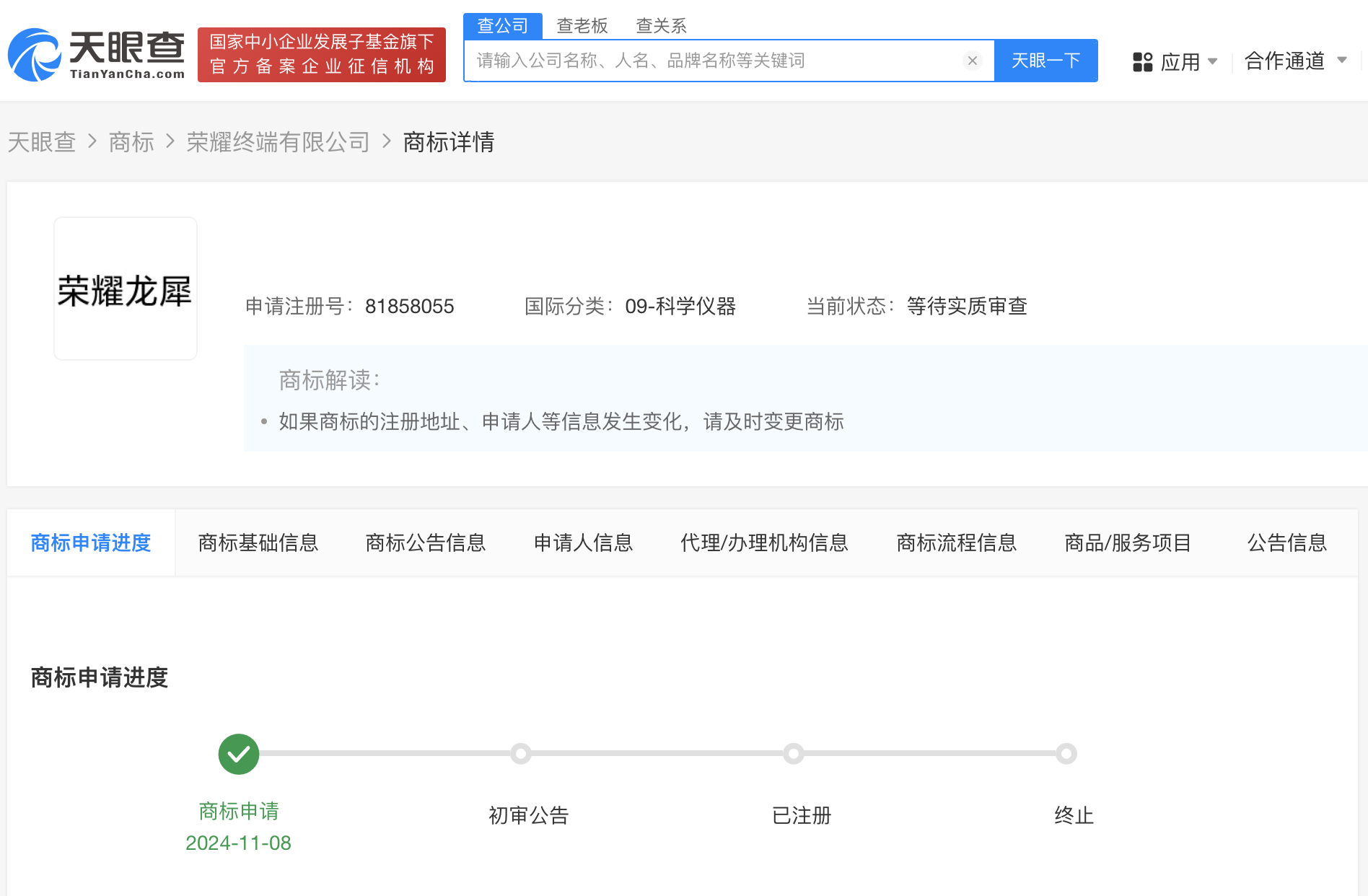 天眼查知识产权信息显示,近日,荣耀终端有限公司申请注册“荣耀龙犀”商标,国际分类为科学仪器,当前商标状态为等待实质审查。据悉,荣耀此前曾推出“巨犀玻璃”,拥有较强的防冲击和抗跌落能力。