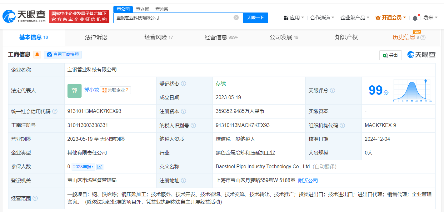 宝钢管业科技有限公司成立于2023年5月,法定代表人为郭小龙,经营范围含钢压延加工、货物进出口、技术进出口、进出口代理、销售代理、企业管理咨询等,现由宝钢股份(600019)全资持股。