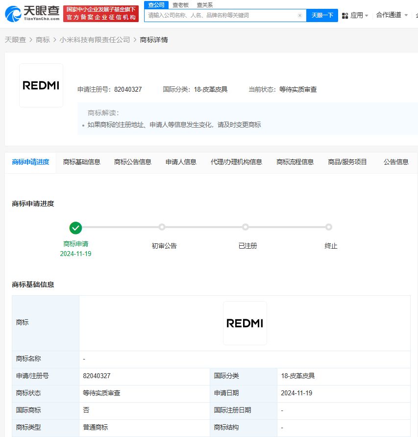 天眼查知识产权信息显示,近日,小米科技有限责任公司申请注册“REDMI”图形商标,国际分类为皮革皮具,当前商标状态为等待实质审查。