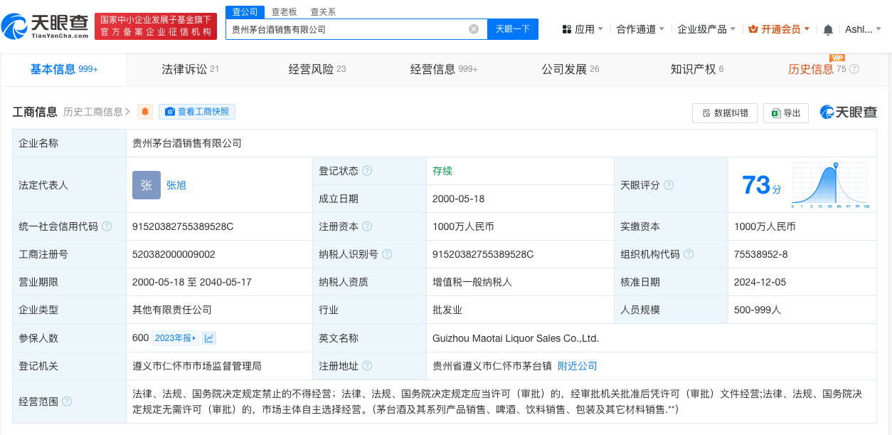 贵州茅台酒销售有限公司成立于2000年5月,注册资本1000万人民币,经营范围含茅台酒及其系列产品销售、啤酒、饮料销售、包装及其它材料销售,由贵州茅台酒股份有限公司、中国贵州茅台酒厂(集团)有限责任公司分别持股95%、5%。
