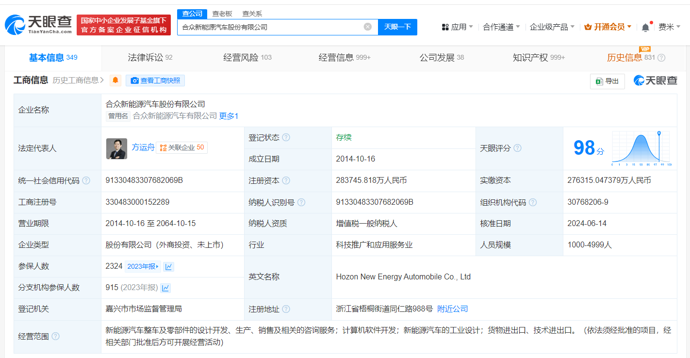 合众新能源汽车股份有限公司成立于2014年10月,法定代表人为方运舟,注册资本约28.4亿人民币,由南宁民生新能源产业投资合伙企业(有限合伙)、宜春市金合股权投资有限公司、桐乡众合新能源汽车产业投资合伙企业(有限合伙)等共同持股。